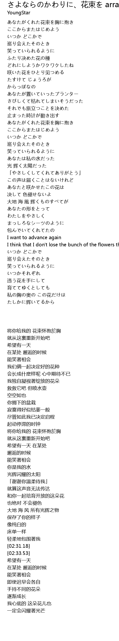 あなたの形(かたち)をとって わたしをやさしく まっしろなシーツのように包(つつ)んでいてくれてたの あなたがくれた 花束(はなたば)を胸(むね)に抱(だ)き ここからまたはじめよう将你给我的花束怀抱于胸就从这里重新开始吧希望有一天在某处邂逅的时候能笑着相会我们一起决定好的花种会长成什么样呢 心中期待不已独自凝望着绽放的花朵救救它吧 但喷水壶空空如也你搁下的盆栽寂寞得好似要枯萎尽管如此 我已决定启程起动停滞的时钟将你给我的花束怀抱于胸就从这里重新